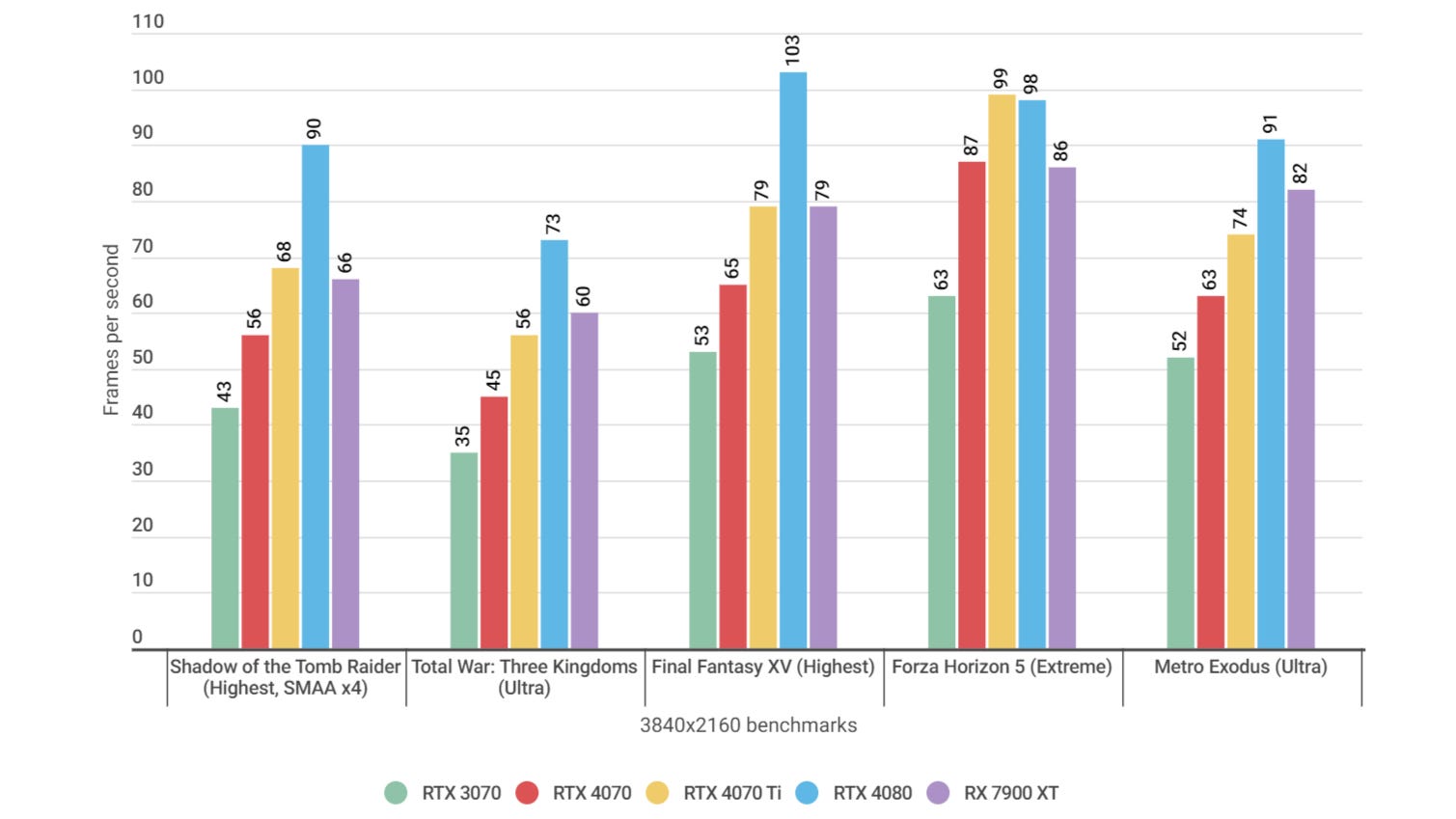 (Also, we don’t have enough RTX 3080 results in the books to include it these graphs, but the ones we do have confirm the RTX 4070 usually matches it within 1-3fps. And sometimes the newer card is respectably faster, with the RTX 3080 only managing 94fps in Shadow of the Tomb Raider and 98fps in Horizon Zero Dawn.)
