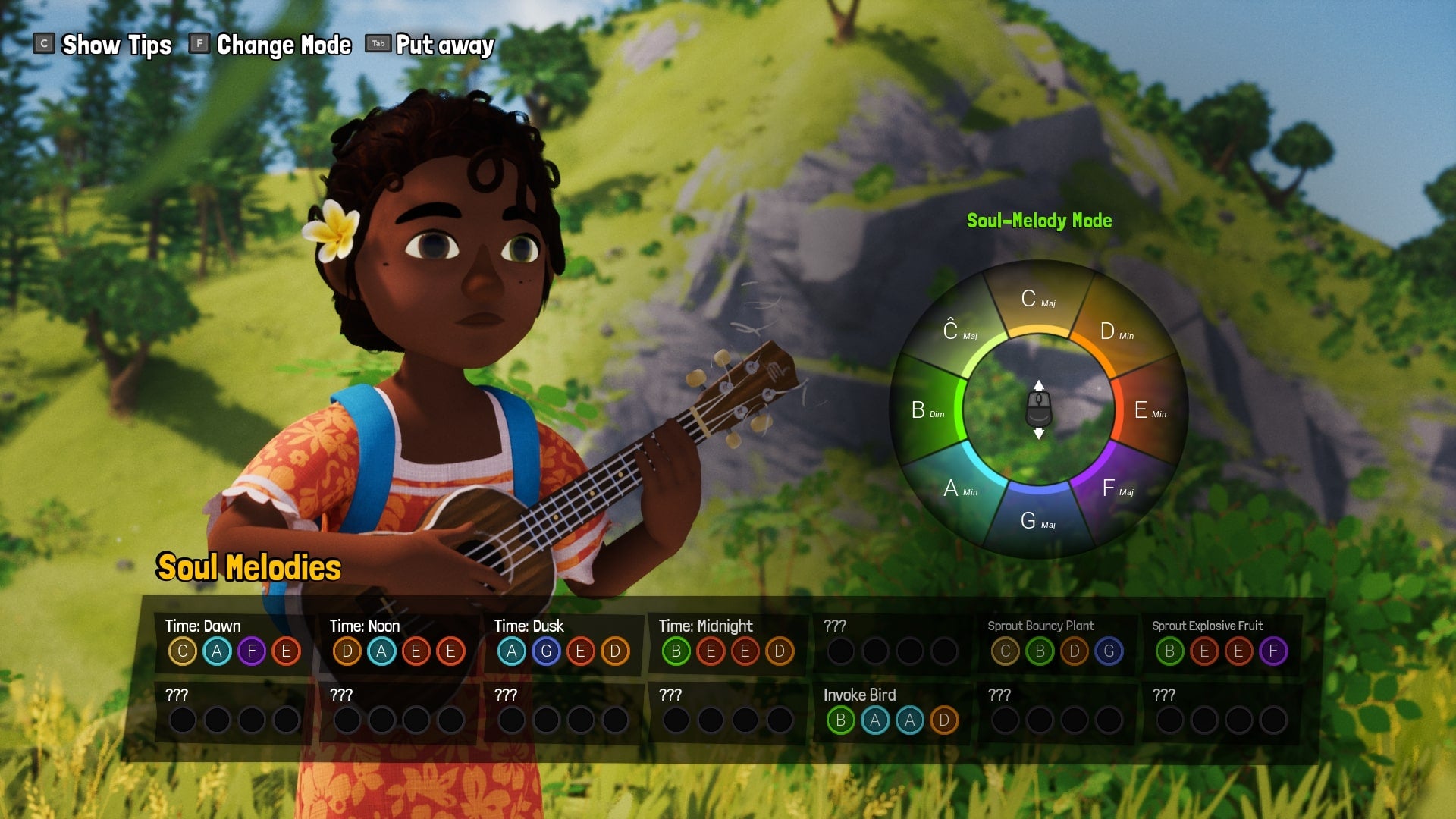 You also have your handy ukulele with you, which you not only get to jam out on during musical cutscenes, but also has magical abilities. Whip it out and start strumming your chords in a certain order and the time of day will change; twang out another combination and you can summon birds to soul-jump into or giant bouncy plants that launch you into the air. There’s a cool-down timer on these abilities, but I only really used them when I was stuck for traversal options (which was maybe once or twice during my handful of hours). Basically, having your handy ukulele means that you’ve never stuck for a ride.