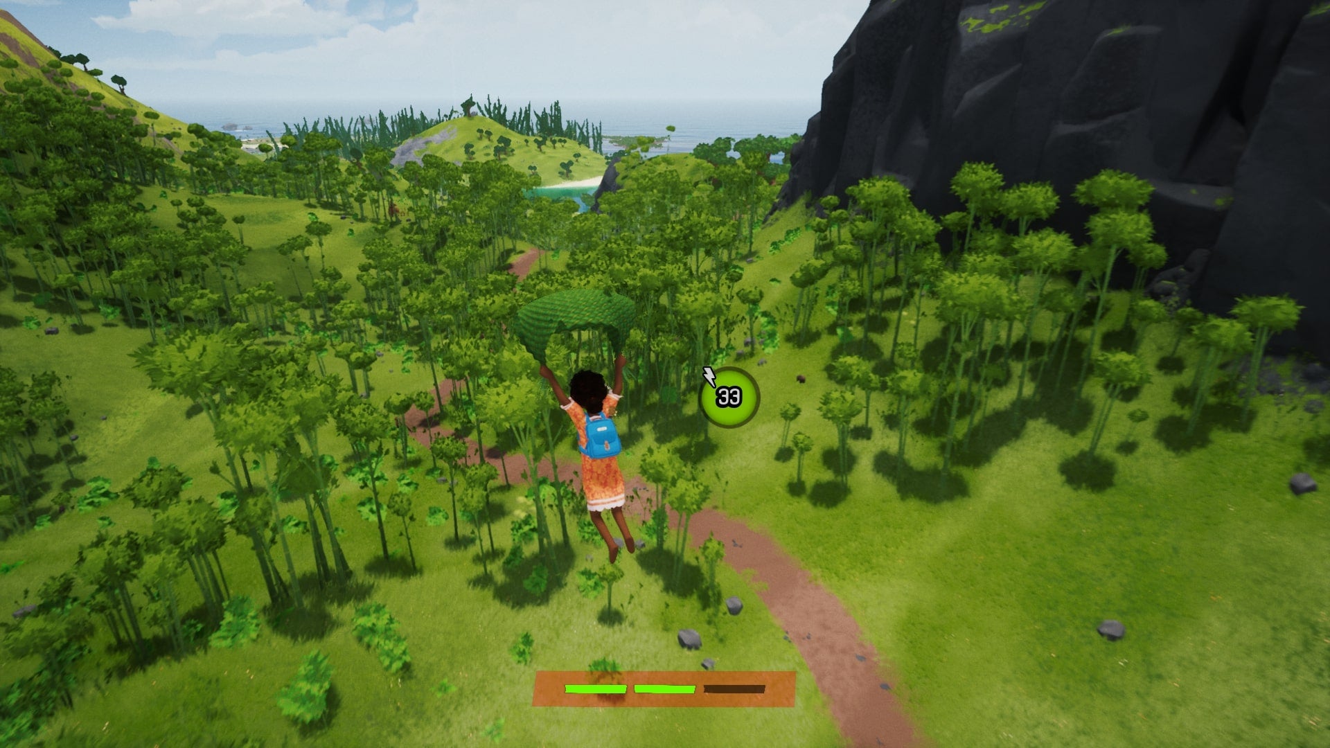 I give Gabby her crab and am introduced to her daughter, Louise, who says she can help me find one of the items on my list: a dead chicken. She tells me to meet her further inland, so it’s time to explore the island some more. Walking is for losers, so it’s time to try some free climbing. I scramble up a tree and realise that I can catapult myself from one tree to another, which is awesome. I’m like the New Caledonian Spider-Girl with the way I'm moving across the island. When I get enough height, I bust out my glider and sail back down to the ground.