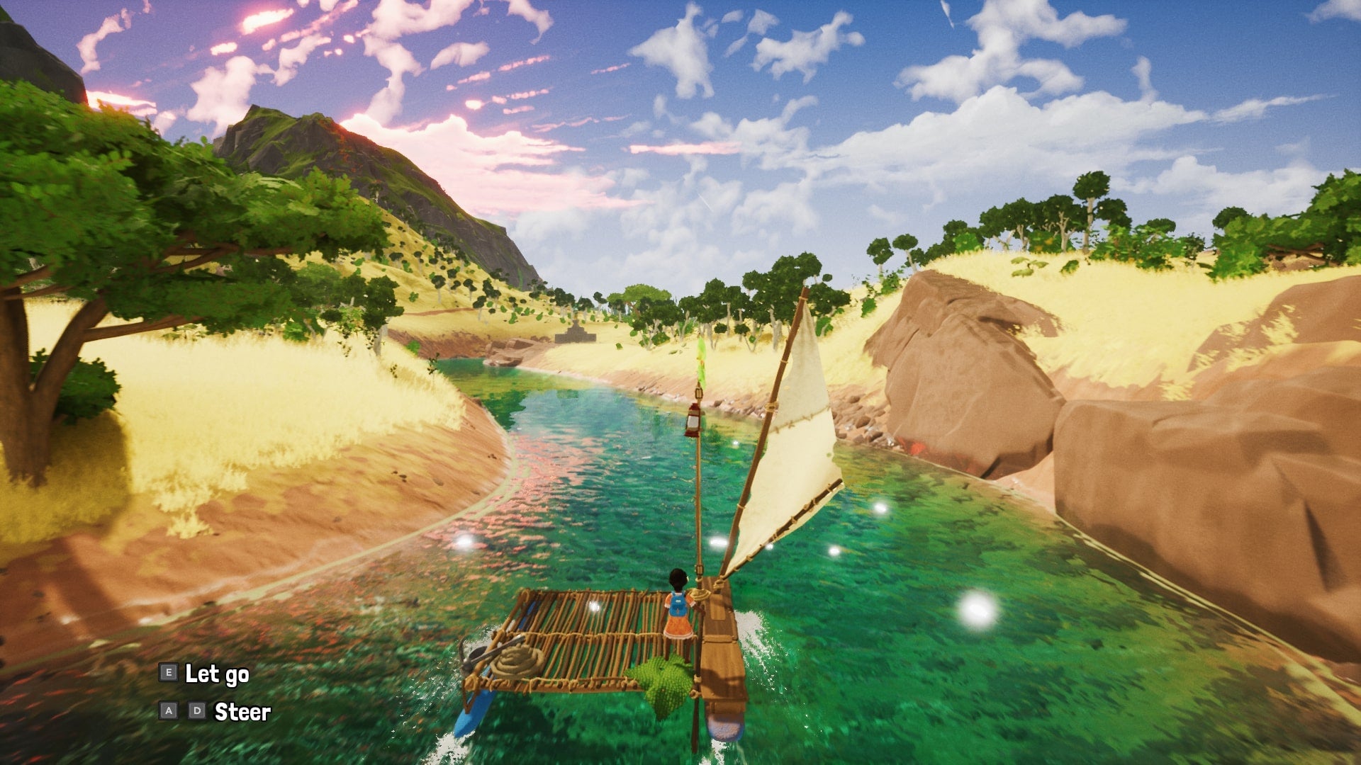 After saying goodbye to my trigger-happy new friend, it’s island exploring time. I leave Gabby's village and immediately spot a raft next to a river, so the first thing I do is jump on it and set sail. Controlling the boat takes a little practice, as you need to run between the sail and the rudder to control the speed and direction, but it doesn’t take long for me to start cruising peacefully along the island’s rivers on my crab quest. It’s also my first opportunity to really take in the island which, to put it plainly, is utterly gorgeous.